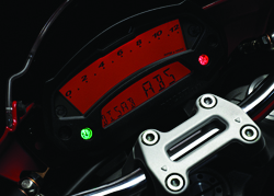 STRUMENTAZIONE. La strumentazione, interamente digitale, permette di avere sempre sotto controllo le prestazioni del Monster grazie alle varie visualizzazioni offerte dal computer di bordo. Le informazioni disponibili al minimo tocco delle dita includono avvisi di manutenzione, temperatura dell’olio, contachilometri, tempo sul giro, spia riserva carburante, avviso di bassa pressione dell’olio, frecce, segnale fuorigiri, folle e immobilizer.