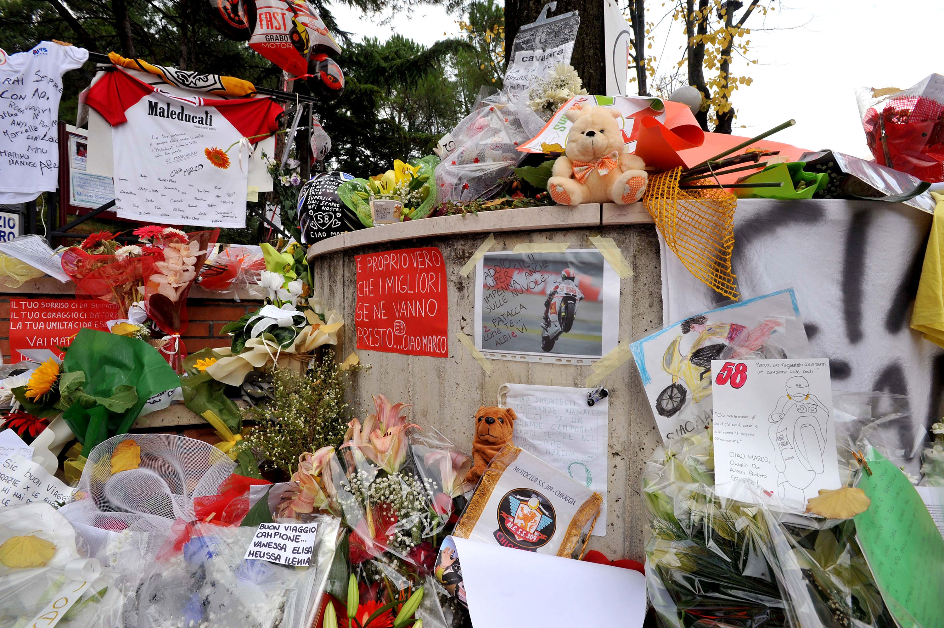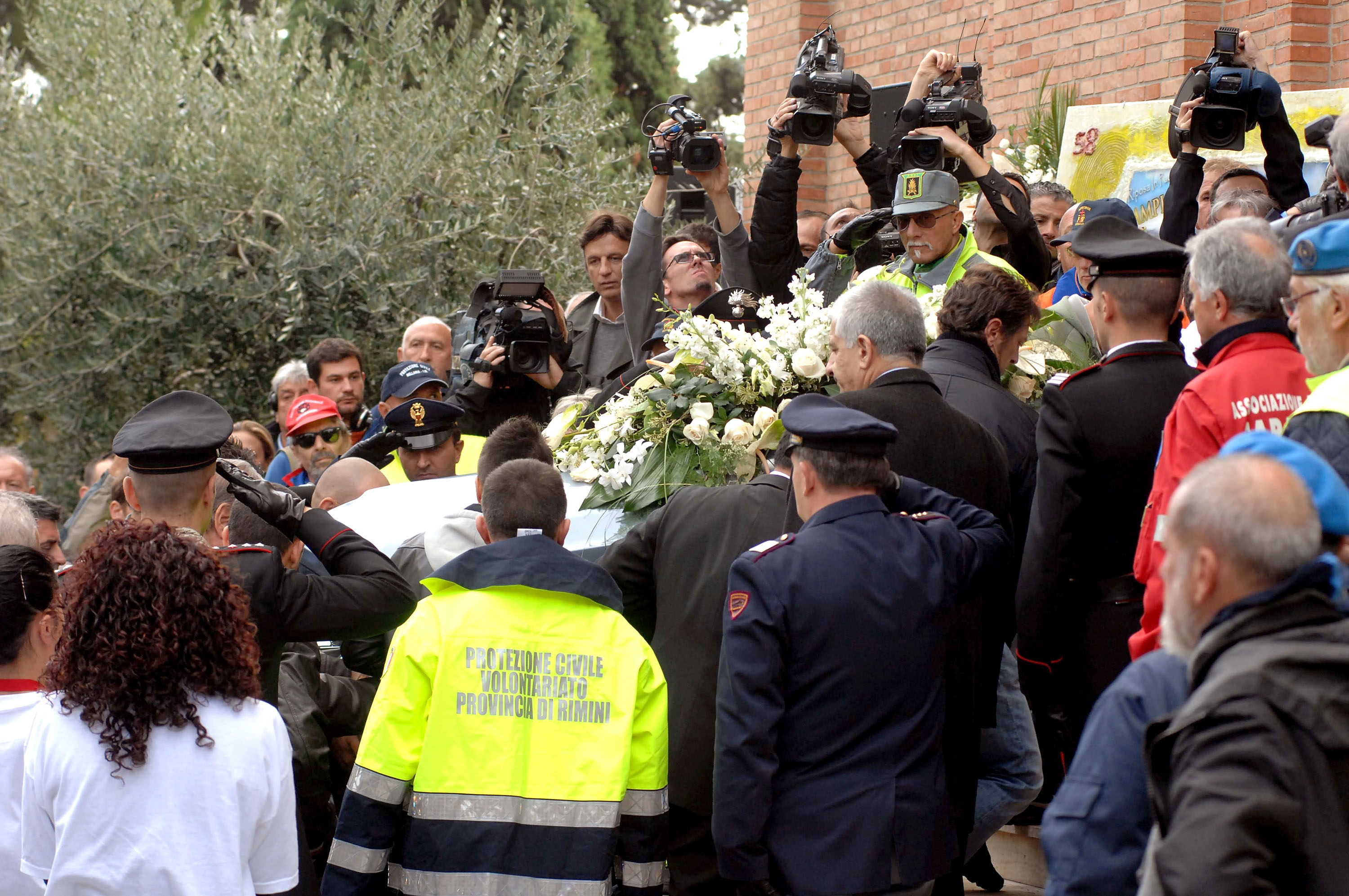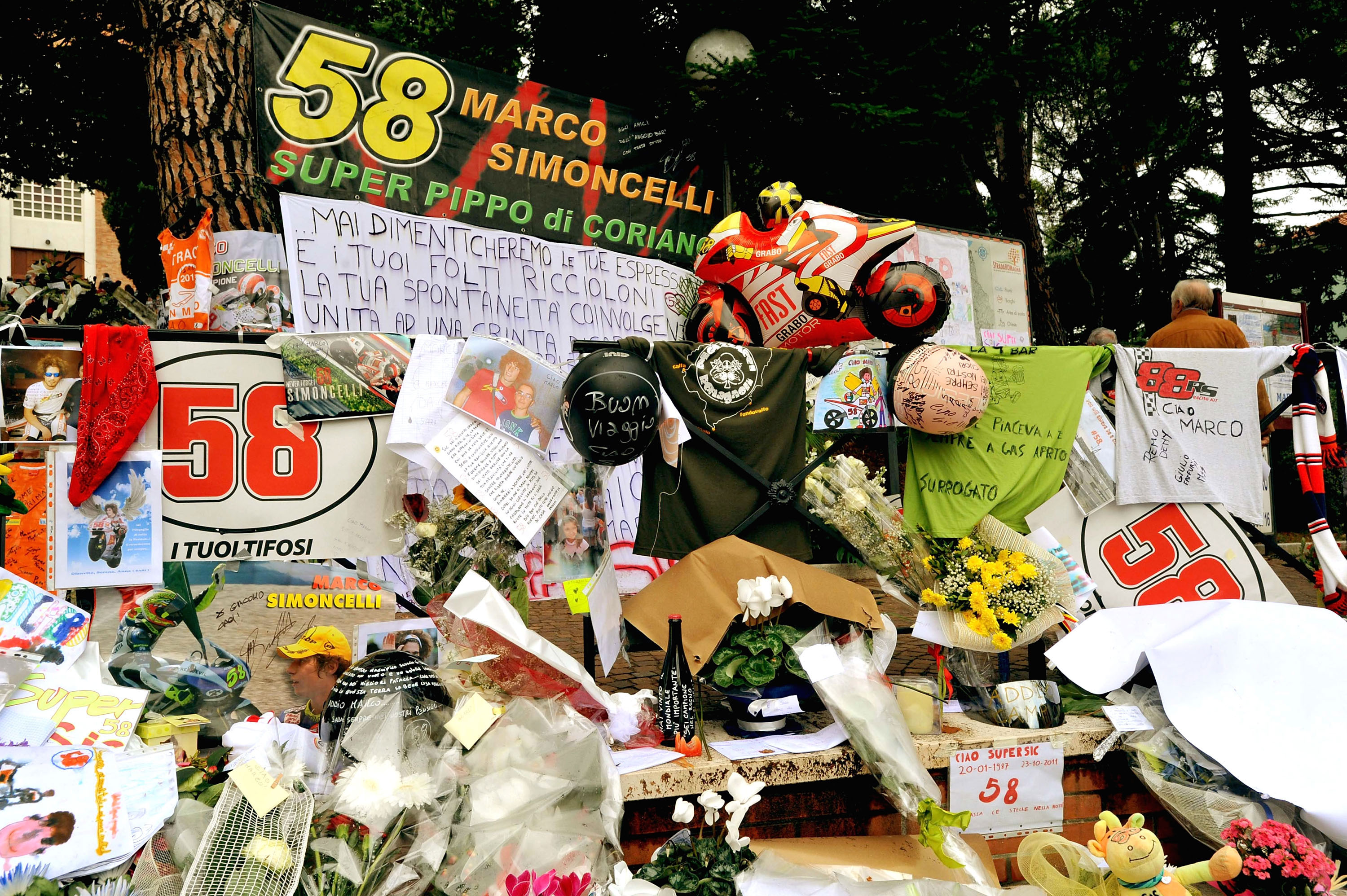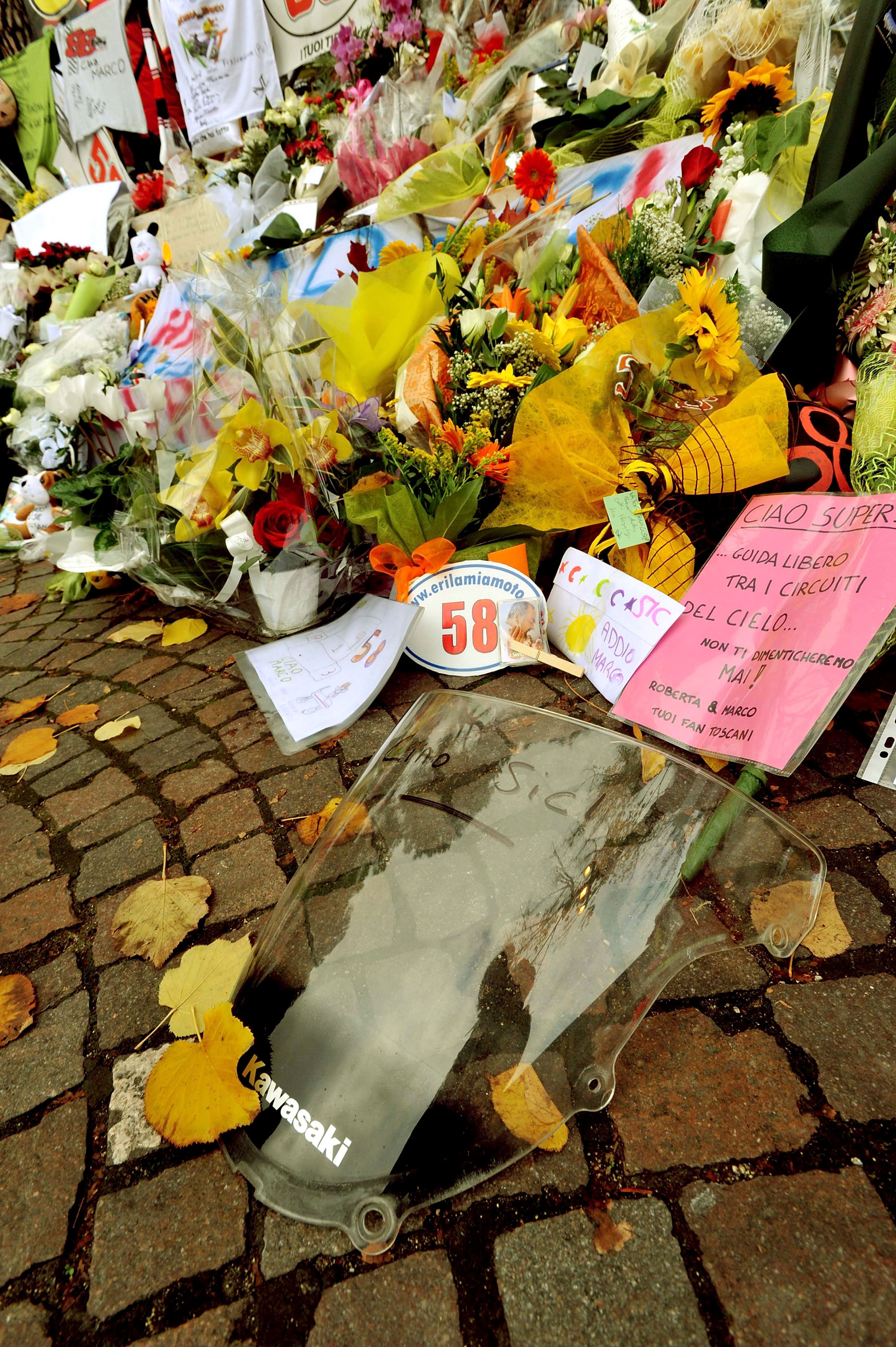 L’ultimo saluto a Marco Simoncelli raccontato dalle fotografie scattate nel corso delle esequie. Volti e biglietti, la calca, i fiori che erano un’infinità, palloncini in cielo. E poi. Poi tutti. ValeRossi, papà Paolo, mamma Rossella, Martina e Kate, Capirex che ha pianto a dirotto, Giacomo Agostini che non contiene l’emozione, la gente comune. Quella di tutti i giorni e gli altri. Arrivati da ogni località d’Italia. E le note di Vasco Rossi tra le parole del vescovo di Rimini che hanno commosso ed emozionato. Poi. Lacrime e sorrisi. Tante lacrime in mezzo a una caterva di sorrisi come se fosse facile. Piangere e ridere così. Le immagini: