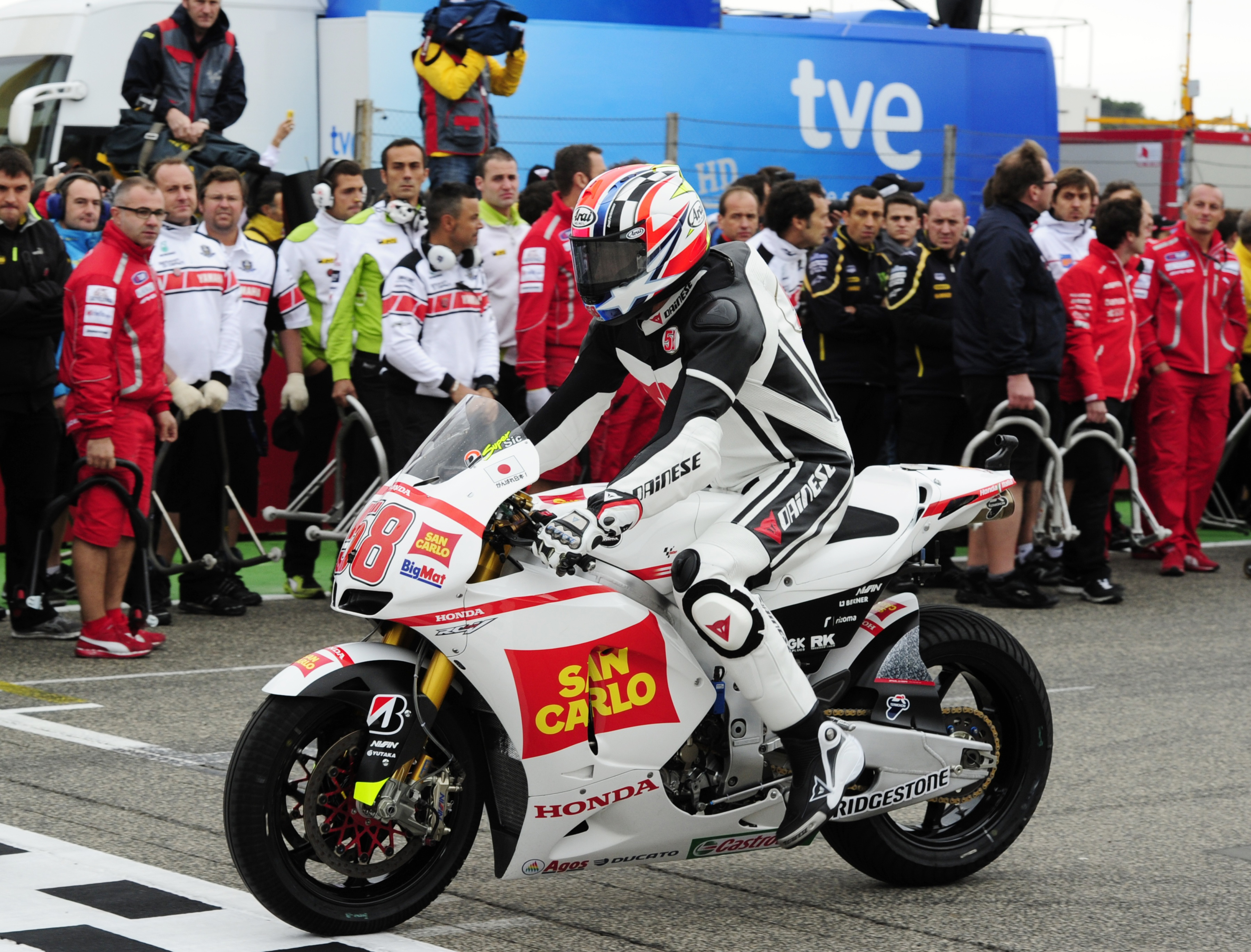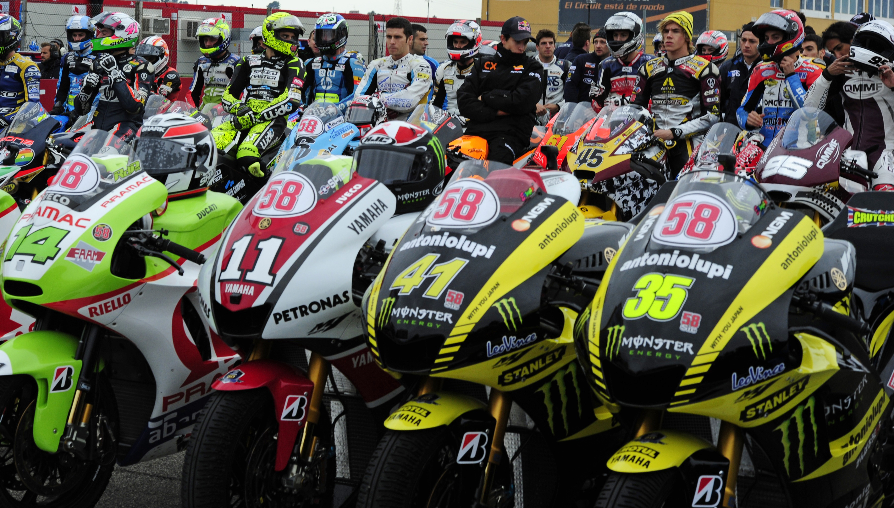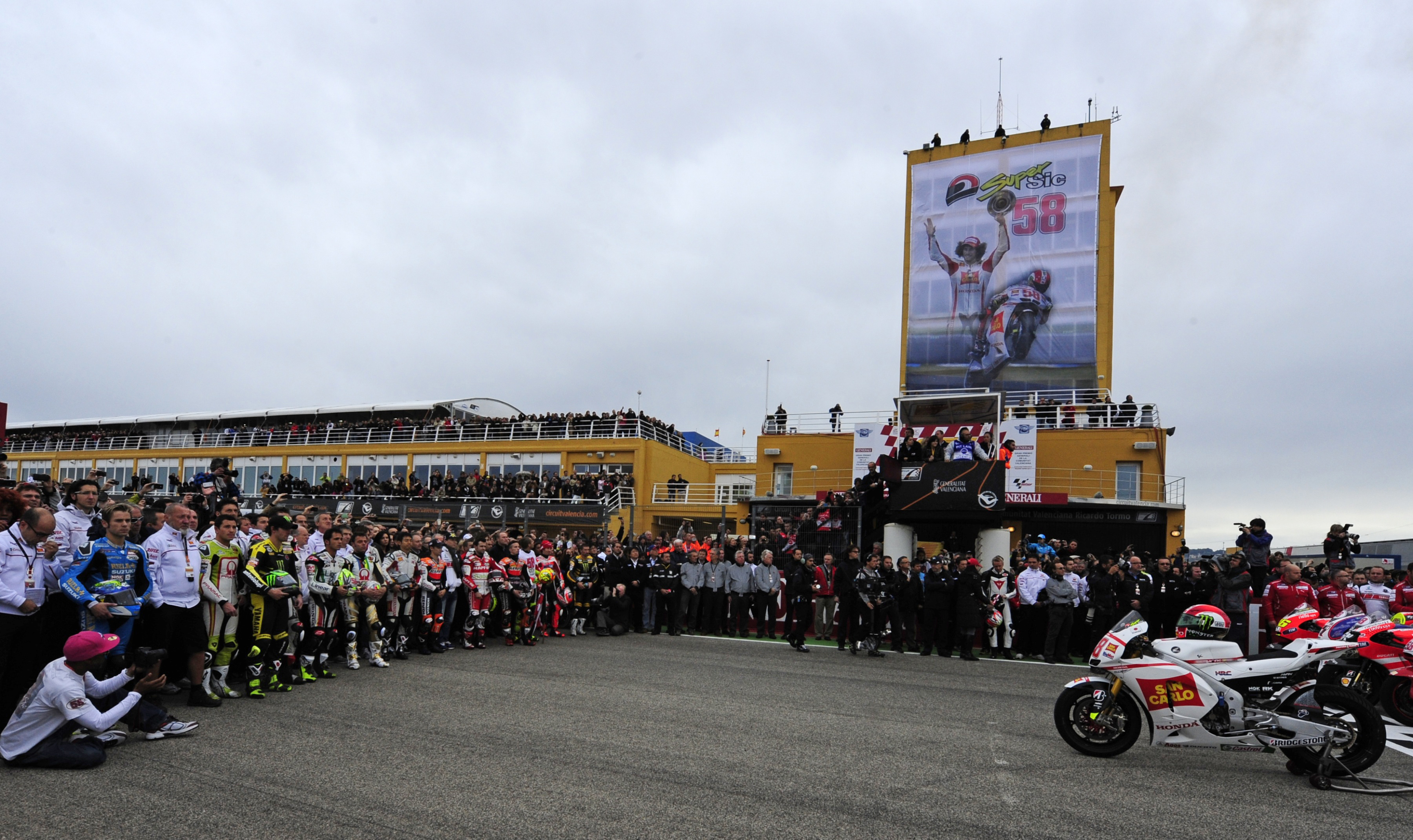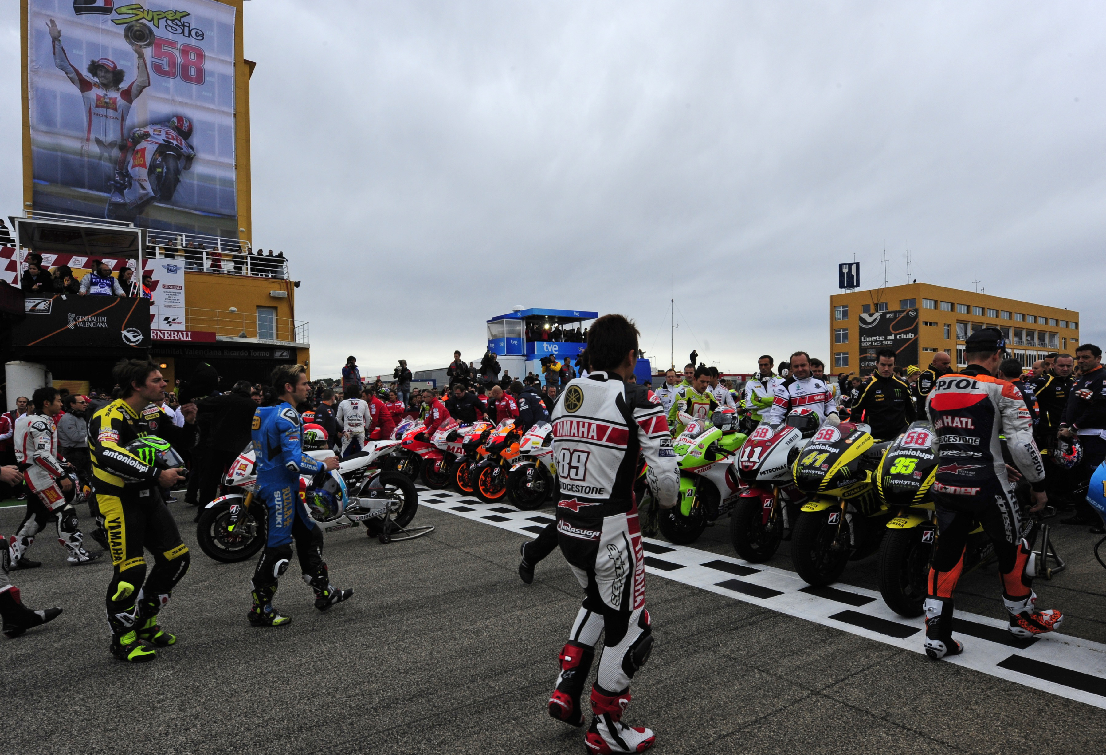 La parata ha avuto luogo senza alcun ritardo: omaggio a Marco Simoncelli nel corso della domenica di gare a Valencia con un giro di pista del quale sono state protagoniste tutte le moto e tutti i piloti, indistintamente dalla classe di appartenenza.