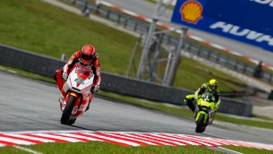 Nelle qualifiche dello Shell Advance Malaysian Motorcycle Grand Prix, penultima prova della stagione 2011, Thomas Luthi (Interwetten Paddock Moto2) ha ottenuto il tempo più rapido del gruppo beffando il tedesco Bradl, guadagnandosi così la prima posizione nella griglia di partenza di domani. Per lo svizzero la pole é arrivata con il tempo di 2:07.512. Con il secondo tempo, come detto, partirà uno dei due contendenti al titolo 2011, Stefan Bradl di Viessmann Kiefer Racing, che ha registrato il suo miglior tempo al terzo dell’International Circuit con un 2:07.724, a 212 da Luthi. A chiudere il trio ci pensa Michele Pirro (Gresini Racing Moto2), che nonostante un passaggio nella ghiaia a metà sessione, riesce ad ottenere il terzo tempo del pomeriggio: per l’italiano un 2:08.004 (+0.492s) che gli vale la prima partenza dalla prima fila della sua carriera in Moto2. Seconda fila che si apre proprio con il compagno di squadra di Pirro, il giapponese Yuki Takahashi, che ha girato con un 2:08.069, a 557 millesimi dalla pole. Completano la seconda fila i due fratelli Espargaró: Pol (HP Tuenti Speed Up) scatterà dal quinto posto con il suo 2:08.107 (+0.595s), mentre Aleix (Pons HP 40) chiuderà il trio grazie ad un crono di 2:08.154 a 642 millesimi da Luthi. Dalla terza fila scatteranno il finlandese Mika Kallio (Marc VDS Racing Team), l’italiano Claudio Corti (Italtrans Racing Team), e l’inglese Scott Redding (Marc VDS Racing Team). La griglia di partenza prevede poi in quarta fila l’italiano Mattia Pasini (Ioda Racing Project), il sammarinese Alex De Angelis (JiR Moto2) vincitore a Motegi, e lo spagnolo Esteve Rabat (Blusens-STX). Apriranno la quinta fila la coppia di piloti italiani Andrea Iannone (Speed Master) e Simone Corsi (Ioda Racing Project). L’altro grande protagonista della corsa al titolo Moto2, lo spagnolo Marc Marquez (Team CatalunyaCaixa Repsol), é ancora alle prese con i forti dolori muscolari seguiti alla rovinosa caduta delle FP1. Sono appena tre i punti lo separano dal rivale Bradl al vertice della classifica generale: Marquez domani sarà dunque chiamato a ripetere la straordinaria rimonta messa in scena solo una settimana fa in Australia per impedire al tedesco di Viessmann Kiefer Racing di laurearsi Campione del Mondo.