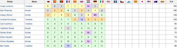 Intanto, per il centauro Honda si tratta del quinto successo nelle ultime otto gare. Lorenzo sa bene che, a questo punto, non va commesso il minimo errore: al maiorchino potrebbero bastare tre piazzamenti e una tattica difensivista dopo il secondo posto della sfida odierna: