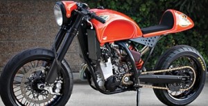 L’ultima splendida creatura della Roland Sands è la KTM 525 EXC Cafè Racer.Già dalle componenti tecniche si può ammirare il nuovo gioiellino,con telaio e motore che restano gli stessi della precedente versione Sands,mentre è stata installata una forcella ridotta, con delle piastre di serie, con piedino per la pinza freno a 4 pistoni. Inoltre sono stati abbassati avantreno e retrotreno per dare alla moto una immagine stradale. Lo scarico è stato ricostruito in titanio dalla FMF Racing nonostante ci sia a bordo un dB-killer alla sua estremità, ma la grande novità riguarda la costruzione del serbatoio e codino interamente in alluminio. La verniciatura Metal Flake Orange, rendono la Sands KTM 525 EXC Cafè una perfetta racer.