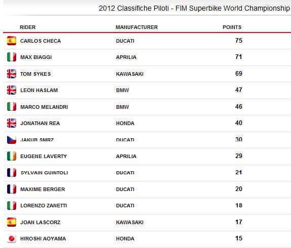 Dietro il podio temporaneo si assestano Leon Haslam con 47 punti e Marco Melandri che ha fin qui conquistato 46 gettoni. Il prossimo appuntamento mondiale – terza gara del 2012 – è in calendario il 22 aprile ad Assen (Olanda).
