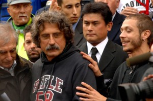 Dopo aver tagliato il traguardo della gara malesiana di Sepang al terzo posto, Valentino Rossi è corso a festeggiare il titolo del Mondo 2009 di MotoGp. Settimo nella massima categoria, nono in carriera (Vale ne ha vinto uno in 125cc e uno in 250cc).